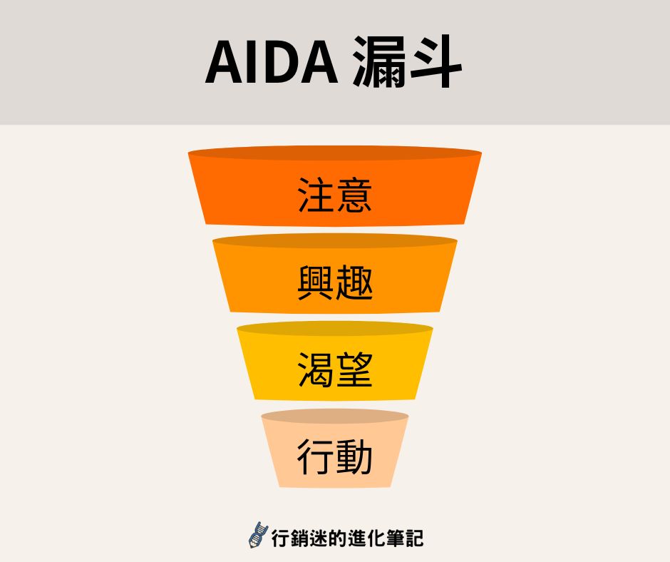 最早的 AIDA 基礎模型,是由美國廣告和銷售先驅 Elias St. Elmo Lewis 提出 ,從注意(Awareness)→ 興趣(Interest)→ 渴望(Desire)→ 行動(Action)的一系列階段。